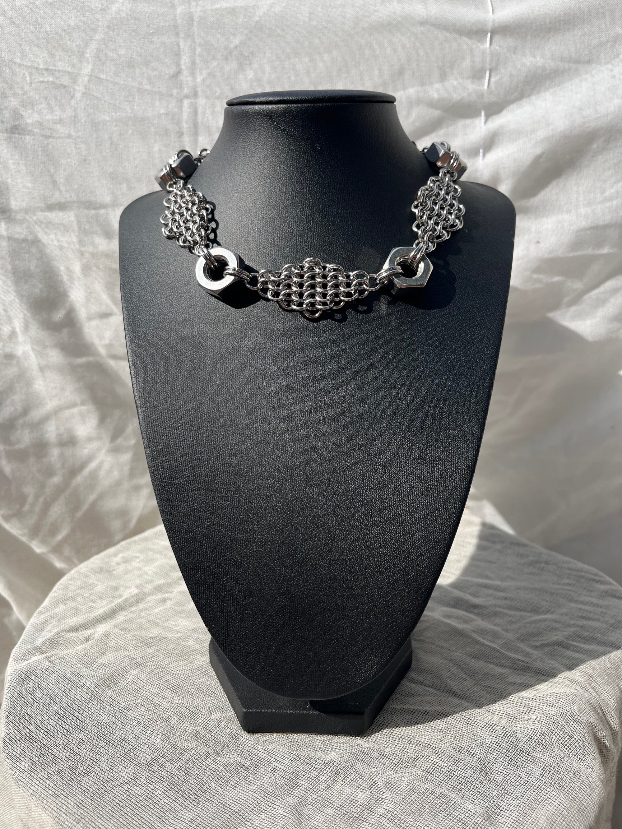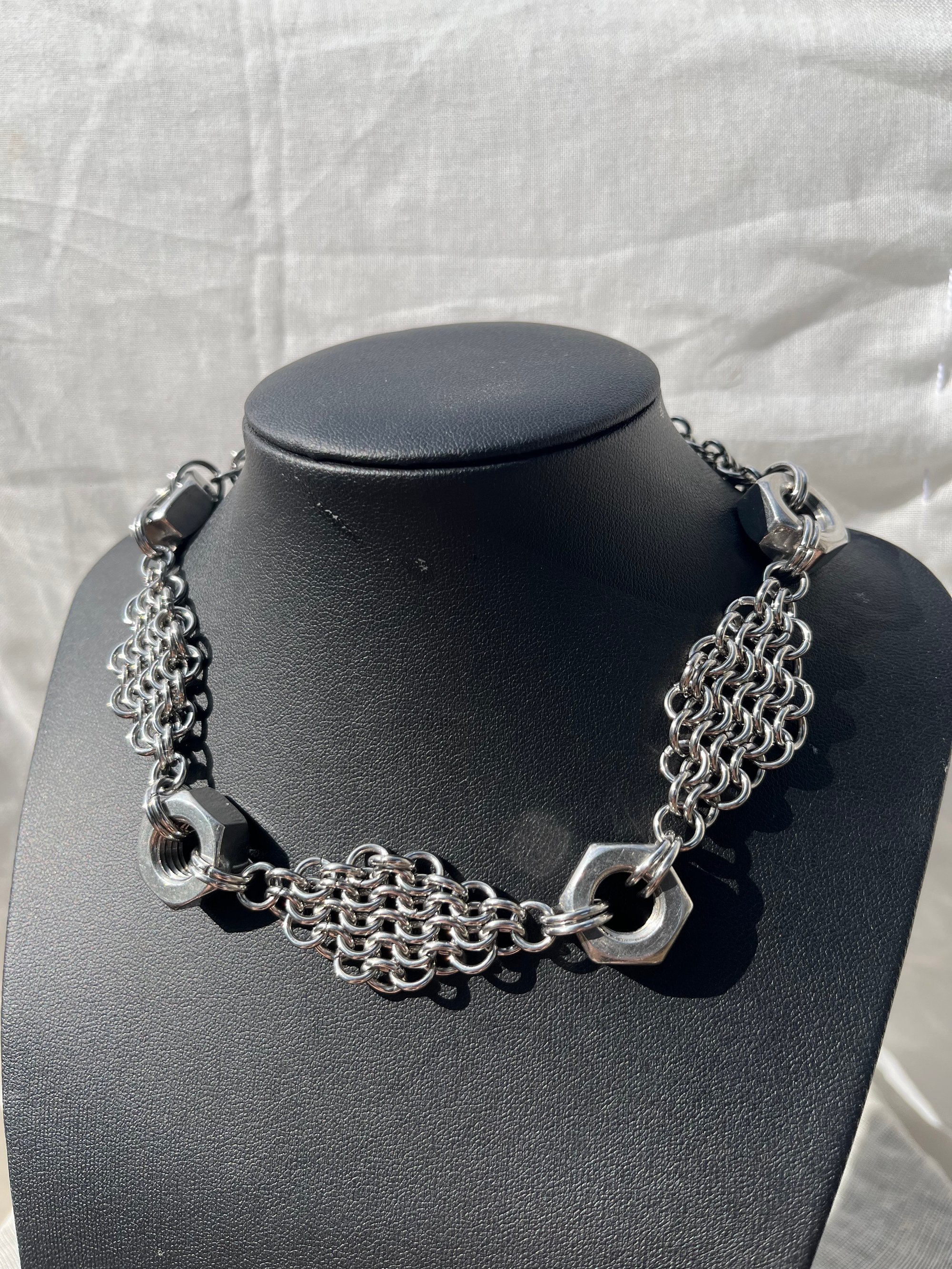 Stainless Steel Chainmail Necklace using the '4-in-1 European' weave, decorated with four large stainless steel nuts. Includes a stainless steel lobster clasp and adjustable length.