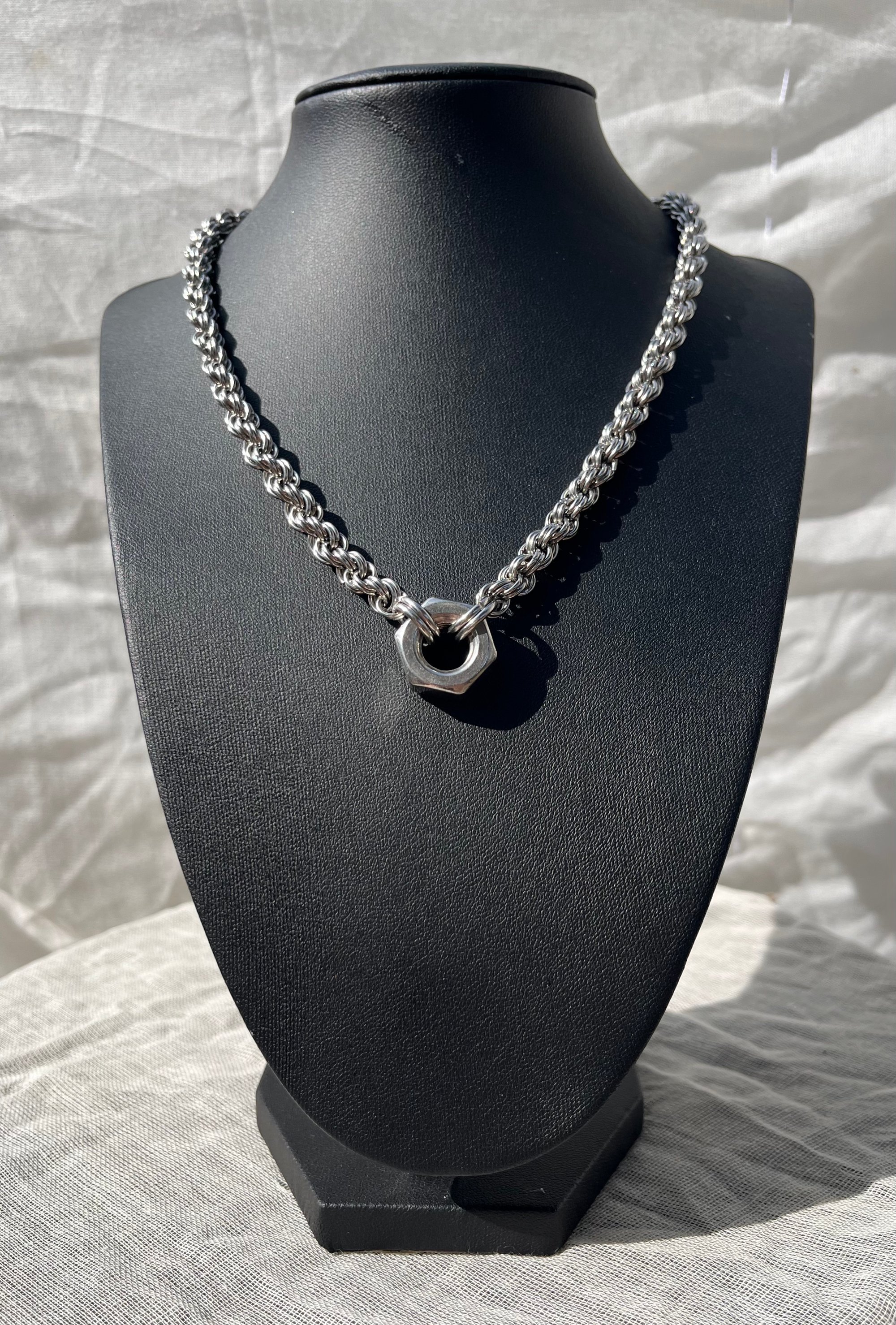 Stainless Steel Chainmail Necklace in the ‘Double Spiral’ weave, decorated with a large stainless steel nut. Includes a stainless steel lobster clasp and adjustable length.