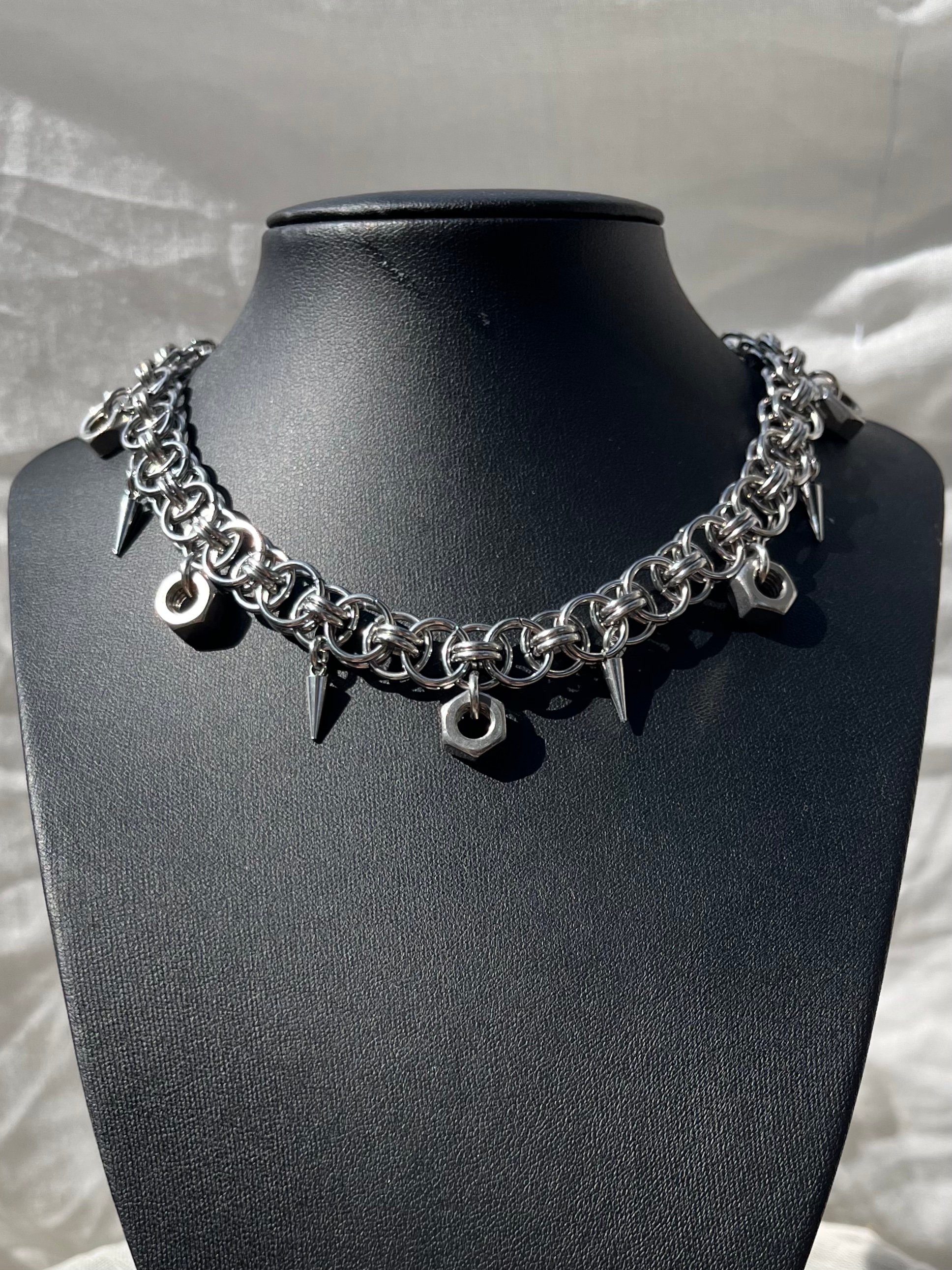 Stainless Steel Chainmail Necklace in the ‘Helm’ weave, decorated with four stainless steel spikes and five nuts. Includes a stainless steel lobster clasp and adjustable length.
