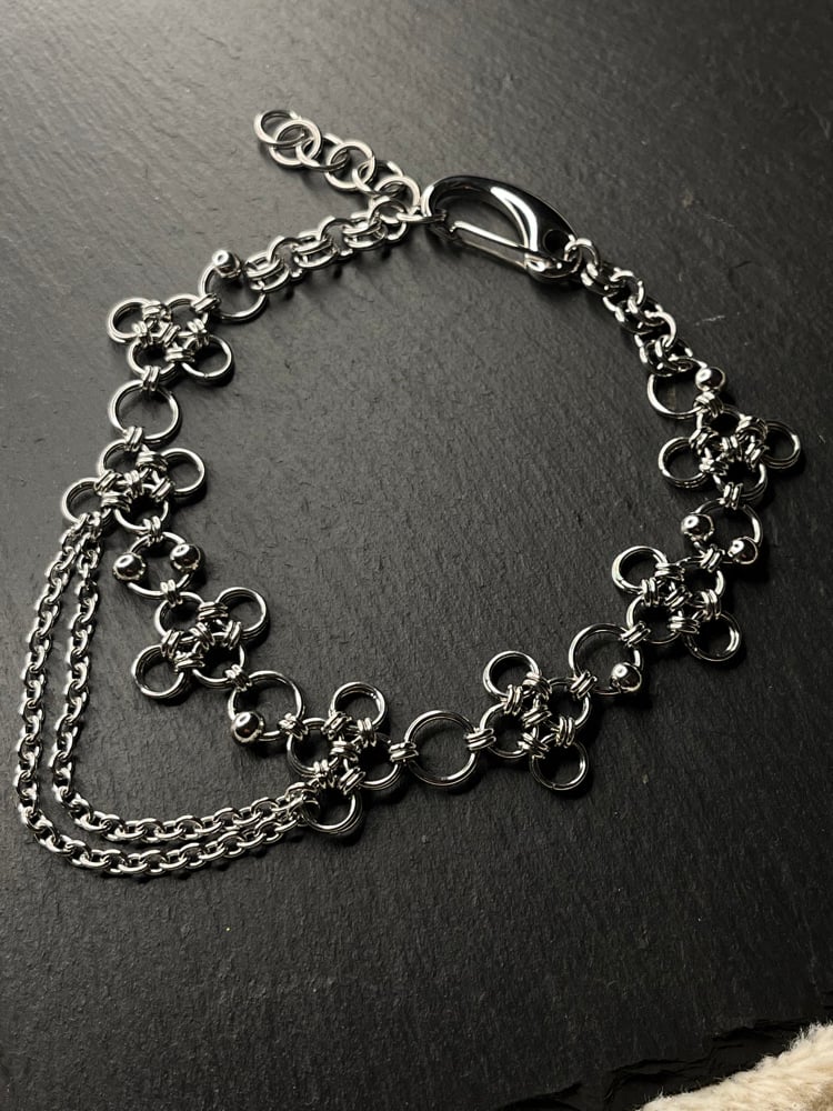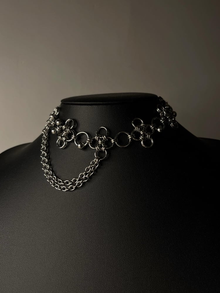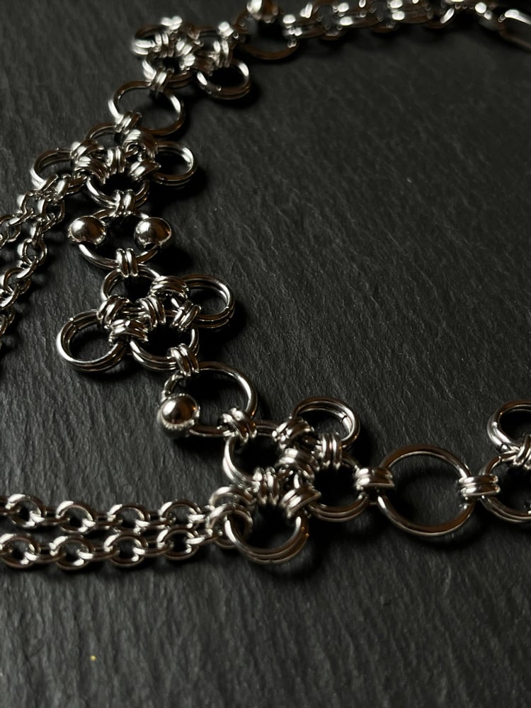 Stainless Steel Chainmail Choker made with the 'japanese 12-in-2' weave. Includes stainless steel beads, clasp and adjustable length.