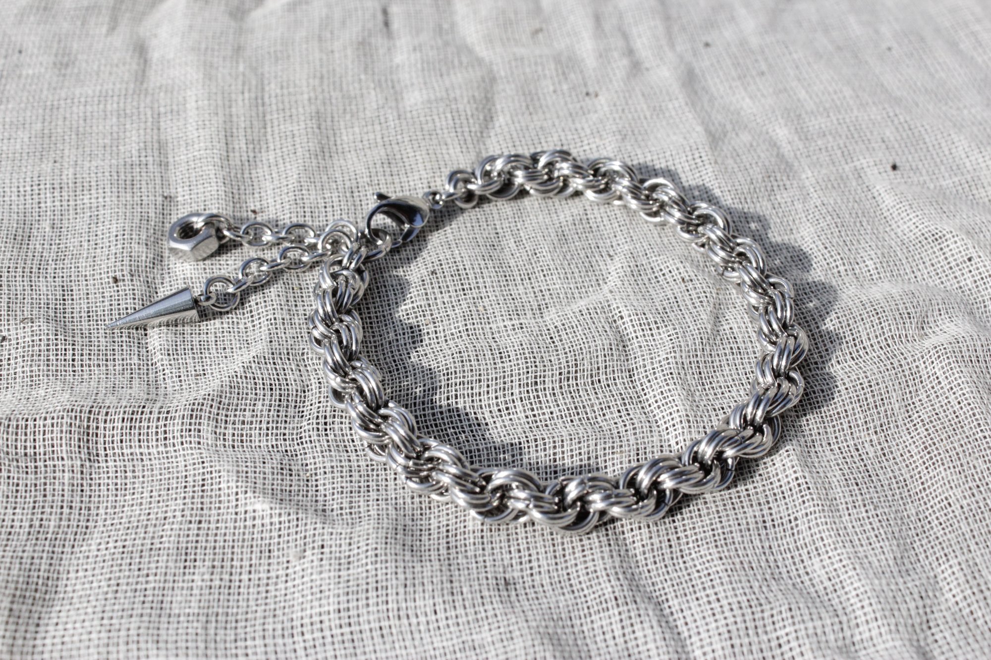 Stainless Steel Chainmail Bracelet with the ‘Double Spiral’ weave, decorated with stainless steel spike and nut on oval chain. Includes a stainless steel lobster clasp.