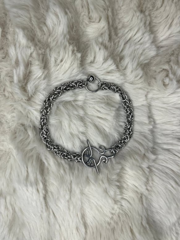 Stainless Steel Chainmail bracelet made with the 'byzantine' weave. Includes stainless steel beads and toggle clasp. There is no adjustable length in the Orbit bracelet series.