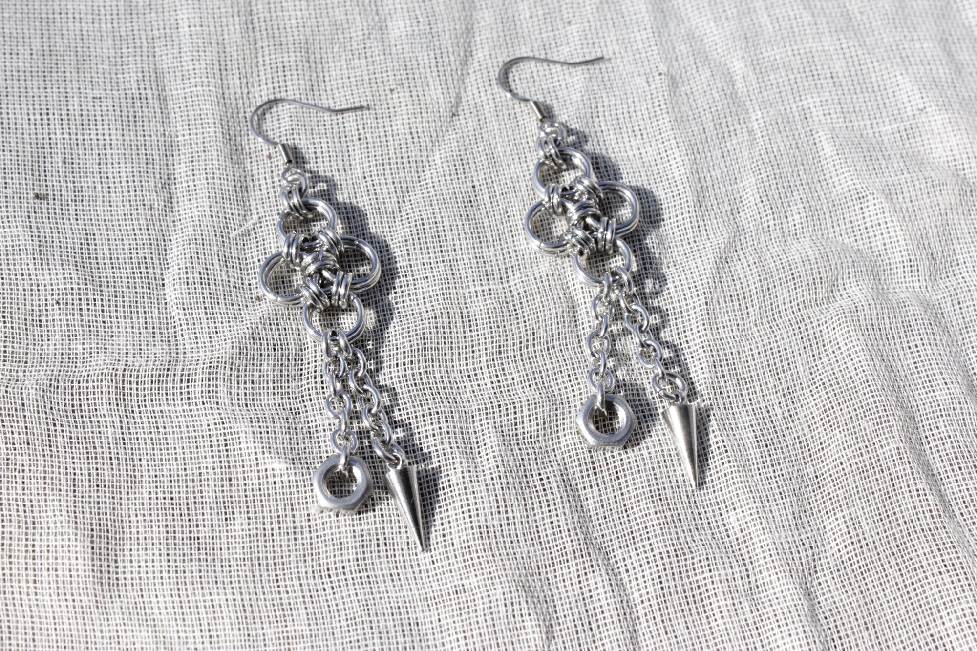 Stainless Steel Chainmail Earrings in the ‘Helm’ weave, decorated with stainless steel spikes and nuts on oval chain. Includes stainless steel earring wires.